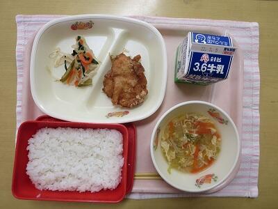 ごはん、牛乳、油淋鶏、茎ワカメとニラの中華和え、白菜と卵のスープ