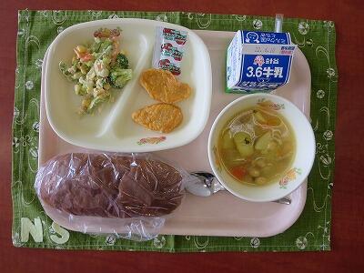 黒パン、牛乳、ナゲット・小袋ケチャップ、アスパラとチキンのサラダ、大豆のカレースープ