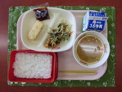 イカ天丼(ごはん)、牛乳、イカ天ぷら・天丼のタレ、梅かつお和え、根菜たっぷり豚汁