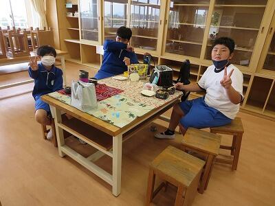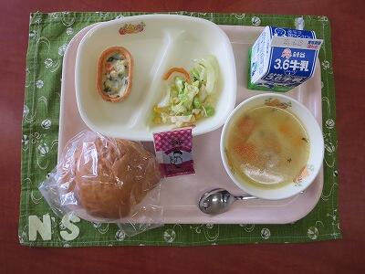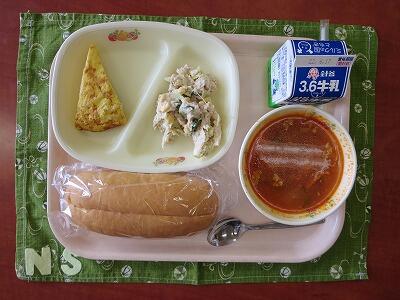 ツナサンド(コッペパン)、牛乳、アンサンブルエッグ、ツナサンドの具、トマトスープ