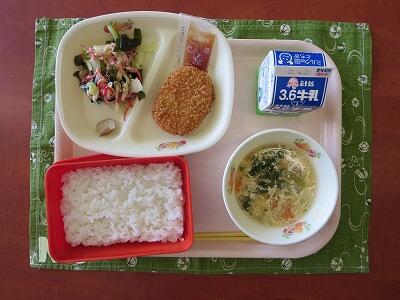 ごはん、牛乳、県産豚肉コロッケ・小袋ソース、かにカマときのこのサラダ、ニラのかきたま汁