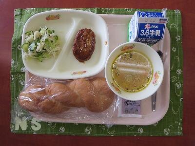 ツイストパン、とちおとめジャム、牛乳、ハンバーグのデミソースかけ、切干大根のサラダ、にんにく風味スープ
