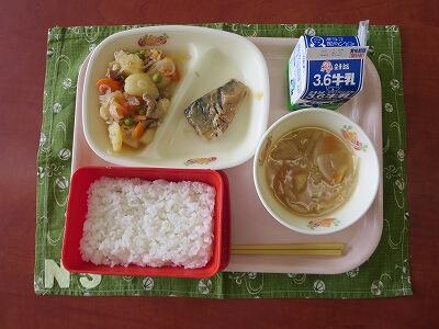 ごはん、牛乳、サバの味噌煮、肉じゃが、吉野汁