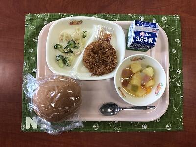 ハムカツサンド(丸パン)、牛乳、ハムカツ・小袋ソース、グリーンサラダ、フルーツポンチ