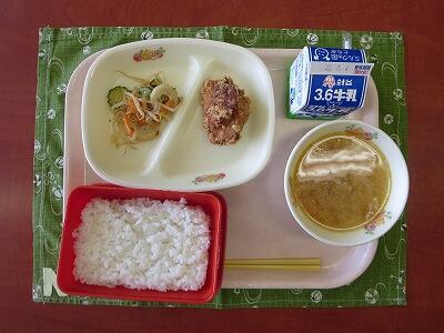ごはん、牛乳、鶏のから揚げ、和風サラダ、どさんこ汁