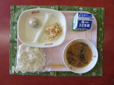 タンタン麺、牛乳、ショーロンポー、キャベツのナムル、タンタン麺の汁