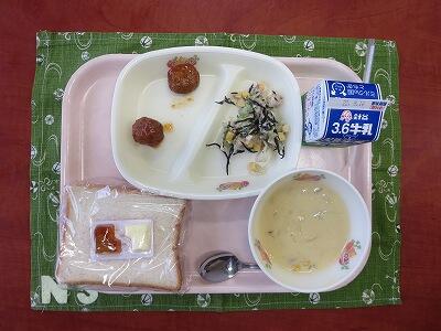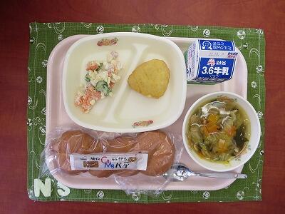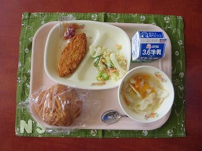 アップルパン、牛乳、かぼちゃひき肉コロッケ・小袋ソース、スイートコーンのサラダ、オニオンスープ