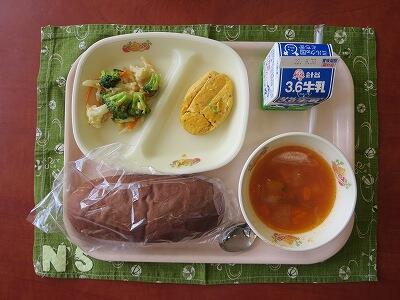 黒パン、牛乳、緑黄色野菜入りたまごよせ、花野菜とパスタのサラダ、ミネストローネ