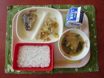 ごはん、牛乳、さばのみそ煮、じゃがいものそぼろ煮、わかめと油揚げのみそ汁
