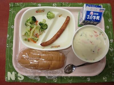 ホットドック(コッペパン)、牛乳、ウインナー、野菜いっぱいサラダ、白菜のクリームスープ