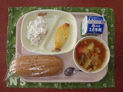フルーツクリームサンド(コッペパン・フルーツクリーム)、牛乳、ツナマヨオムレツ、鶏肉と野菜のトマト煮
