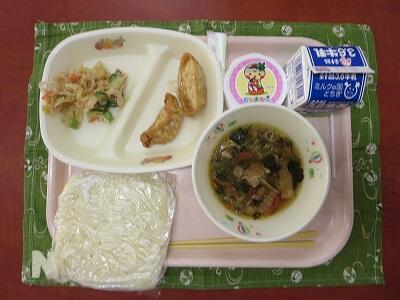 醤油ラーメン(小袋中華麺)、牛乳、揚げ餃子の甘酢あんかけ2ケ、バンバンジーサラダ、醤油ラーメンのスープ、