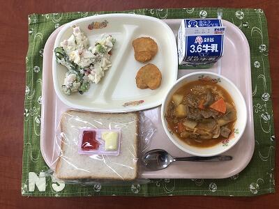食パン、苺&マーガリン、牛乳、チキンナゲット2ケ、オリヴィエサラダ、ボルシチ風スープ