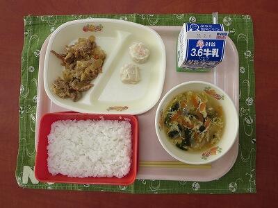 ごはん、牛乳、えびシューマイ2ケ、ホイコーロー、五目卵スープ