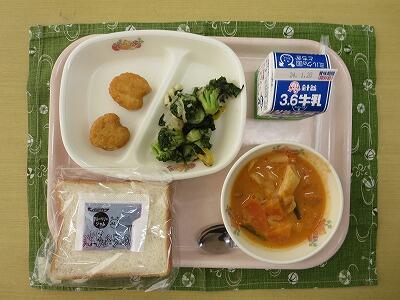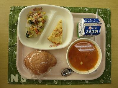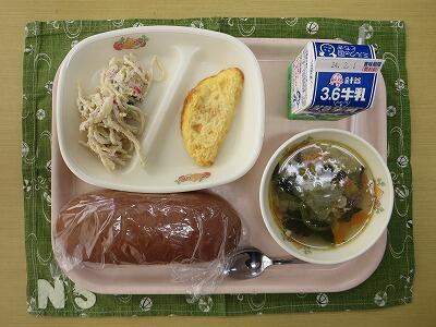 黒コッペパン、牛乳、トマトオムレツ、パスタサラダ、白菜とベーコンのスープ