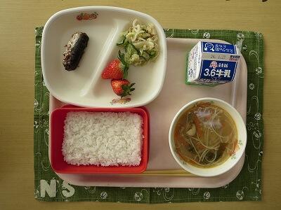 ごはん、牛乳、いわしの生姜煮、キャベツのごまドレ和え、汁ビーフン、真岡市産とちおとめ