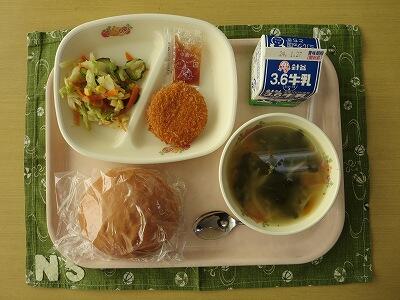 えびコロッケサンド(丸パン)、牛乳、えびマヨネーズ風コロッケ・小袋ソース、野菜たっぷりサラダ、オニオンスープ
