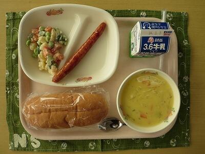 ホットドック(コッペパン)、牛乳、ウインナー、チョップドサラダ、コーンチャウダー