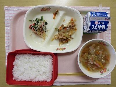ごはん、牛乳、青椒肉絲、もやしと小松菜の中華和え、春雨スープ