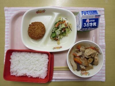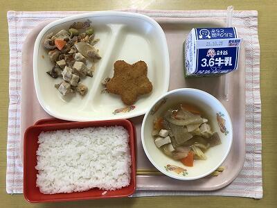 ごはん、牛乳、星のコロッケ・小袋ソース、高野豆腐の煮物、けんちん汁