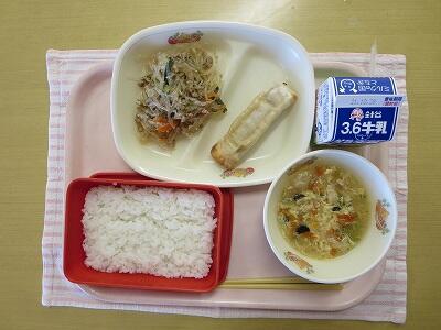 ごはん、牛乳、餃子ロール、チャプチェ、五目中華スープ