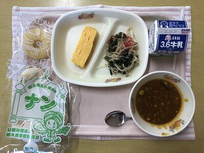 ナン、牛乳、キーマカレー、厚焼き玉子、もやしとワカメのナムル、冷凍パイン