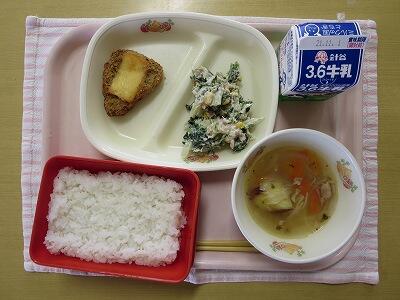 ごはん、牛乳、チキンのオーブン焼き、キャベツとほうれん草のツナ和え、さつまいものコンソメスープ