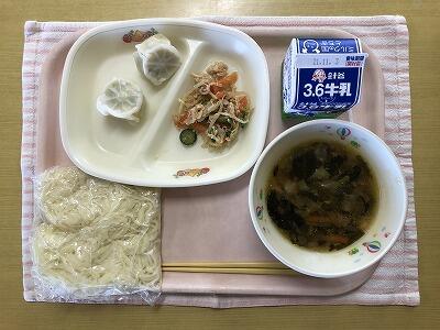 広東風ラーメン、牛乳、枝豆シューマイ2ケ、鶏肉ときゅうりの中華サラダ