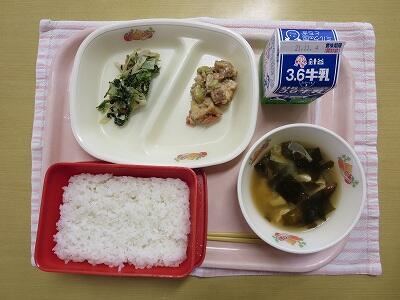 ごはん、牛乳、厚揚げのそぼろ煮、かんぴょうのごま酢和え、ゆばのみそ汁