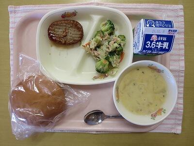 ハンバーガー(丸パン)、牛乳、ハンバーグ、イタリアンサラダ、コーンポタージュ