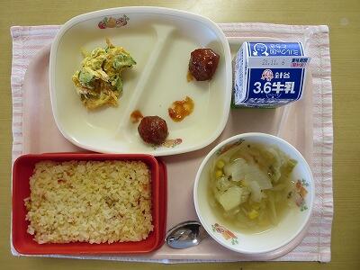 ピラフ、牛乳、ミートボール2ケ、かぼちゃのサラダ、野菜スープ
