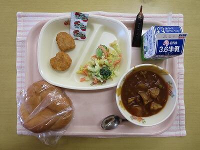 米粉パン、牛乳、ミルメーク、ナゲット2ケ・小袋ケチャップ、シーザーサラダ、ビーフシチュー