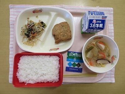 ごはん、のり香味、牛乳、信田煮、梅かつお和え、実だくさん汁