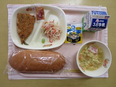 はちみつパン、牛乳、いわしのフライ・小袋ソース、枝豆サラダ、洋風卵スープ、福豆