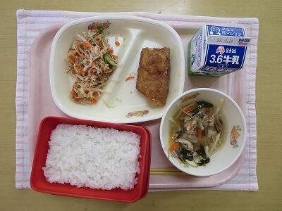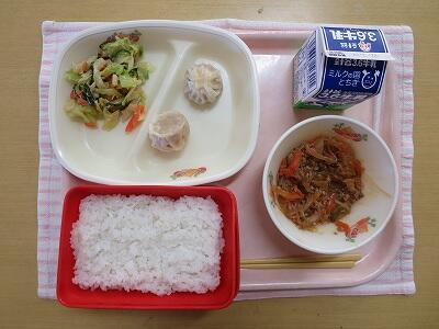 ごはん、牛乳、ショーロンポー2ケ、バンバンジーサラダ、麻婆春雨