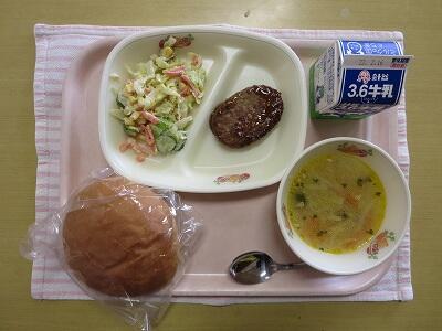 照り焼きバーガー(丸パン・ハンバーグ)、牛乳、コールスローサラダ、オニオンスープ