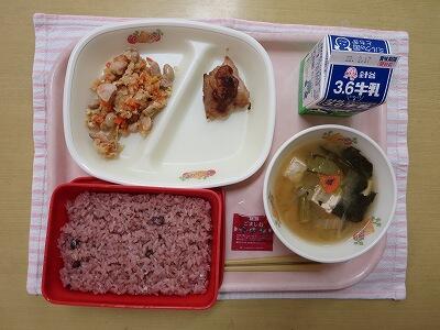 赤飯・ごま塩、牛乳、鶏肉のスタミナ焼き、しもつかれ、小松菜のみそ汁