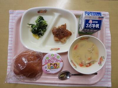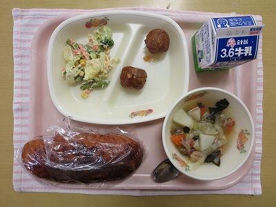 揚げパン、牛乳、野菜いろいろ肉団子2ケ、アスパラとチキンのサラダ、ウインナーと野菜のスープ