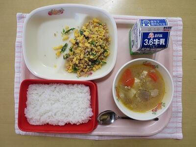 ごはん、牛乳、鶏そぼろ、卵そぼろ、いんげん和え、豚汁