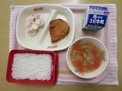 ごはん、牛乳、みそカツ、ポテトサラダ、吉野汁