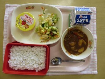 麦ごはん、牛乳、ポークカレー、ミモザサラダ、イチゴとみかんのゼリー