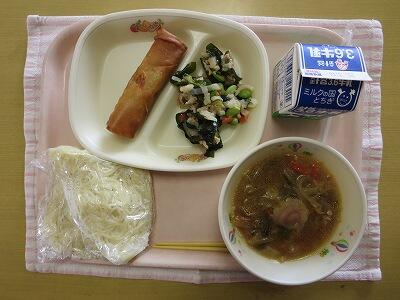 味噌ラーメン、牛乳、春巻き、中華風わかめサラダ、味噌ラーメンの汁