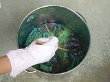 緑色に染まっていた布が、空気に触れると藍色に染まります。