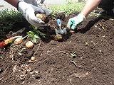 昨日は雨でできなかった、ジャガイモの収穫をしました。イモを傷つけないように移植ごてと自分の手を使って丁寧に掘り出しました。全体的には小粒ですが、しっかり育ったものもいくつかあります(右写真)。今度の調理教室で子どもたちと味わう予定です。