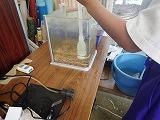 今年度に入ってから2回ほど掃除をした水槽ですが、かなり緑色になってしまいフィルターも汚れている様子で、掃除をしなければと気にはなっていたのですが、やっと今日「梅雨の晴れ間」?を利用して、掃除をすることができました。水槽の水を抜いて(その前に金魚と川エビとドジョウとタニシ?はバケツに移動)、水槽を外のコンクリートの上に運び、たわしやスポンジを使ってこびりついた藻を落としました。(左・中写真) 右が見違えった水槽です。