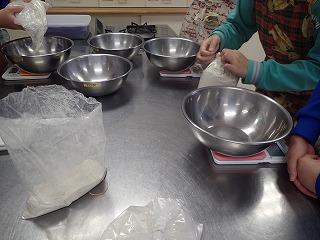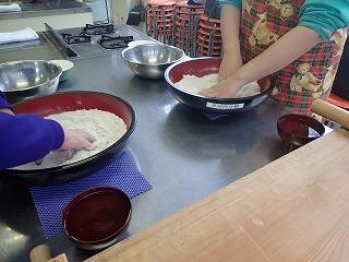 公民館の調理室を借りて、ボランティアの先生に教えていただく「そば打ち体験教室」です。そば粉が8割、小麦粉が2割の二八そば、うまく水がまわらなかったり、麺打ちでひびが入ってしまったり、苦労しながらやっとできあがりました。