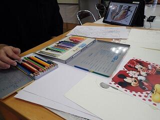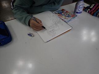 今日は、ボランティアの先生に教えていただく「絵画教室」の3回目です。今日参加した子どもたちは、アニメ好き、全員、イラスト描きに集中です。下絵から彩色に入った生徒は、色づくりに悩んだ様子でした。