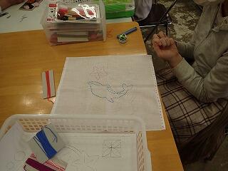 ボランティアの先生の教えていただく「手芸教室」の3回目でした。今日も前回の続きの刺繍で模様を入れた布巾、「花ふきん」の製作です。針の先に心を集中して、一針、一針、縫い進めました。