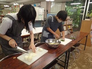 調理教室で、スパゲッティミートソース・オニオンスープ・粉ふきいもを作りました。3グループに分かれて調理を進めました。調理が進むにつれて、料理のいい匂いが部屋の中に広がっていきました。できあがった料理を、みんなでおいしくいただきました。