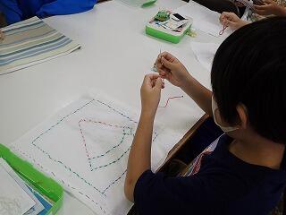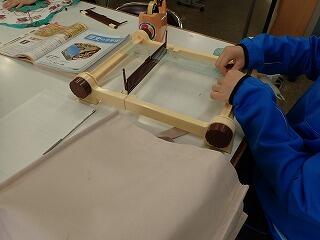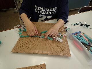 裂き織りコースターづくりをしました。周りに切れ目の入った段ボールに、縦糸となる麻紐を放射状に掛け、ハンカチを細く切り裂いた紐を織り込んでいきます。織っていくと、ハンカチの柄(色)が不規則な模様となって現れ、織ってみるまで分からない楽しさがあります。できあがりが楽しみです。